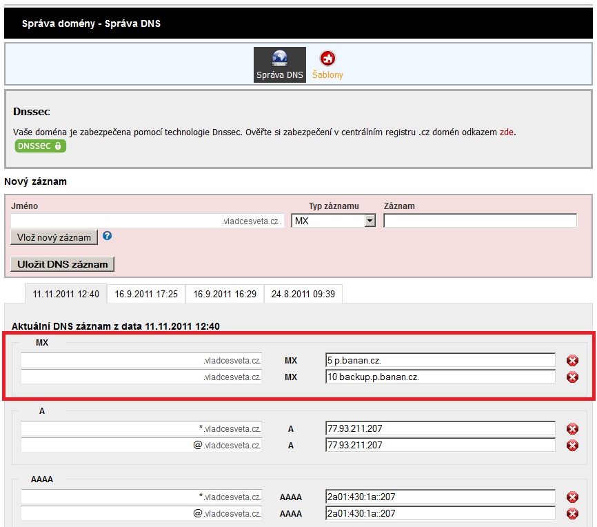 Pokud máte doménu registrovanou u nás, tyto údaje naleznete v administraci na admin.banan.cz v sekci Správa domény -> Správa DNS. Konkrétně se jedná se o MX záznamy a nastaveny by měly být takto: