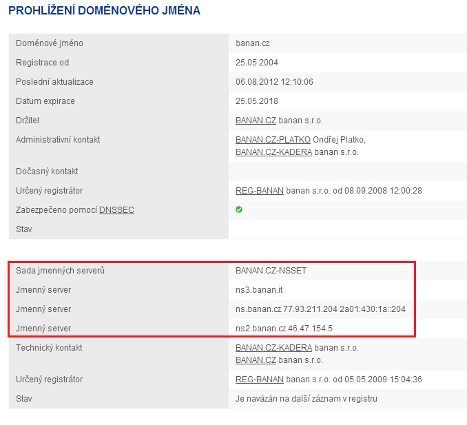 Zajímá Vás informace Sada jmenných serverů/Jmenný server/NSSET/Name Servers. Zde můžete vidět ukázku z nic.cz. Tyto jmenné servery byste měli mít nastaveny.