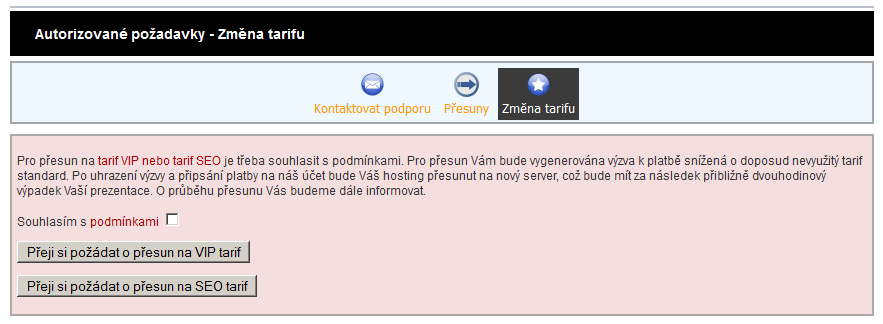V této podsekci lze zaslat požadavek na přechod k VIP a SEO tarifu. Po odeslání žadosti je vystavena nová výzva k platbě a po jejím uhrazení bude hosting přesunut na server s VIP parametry.