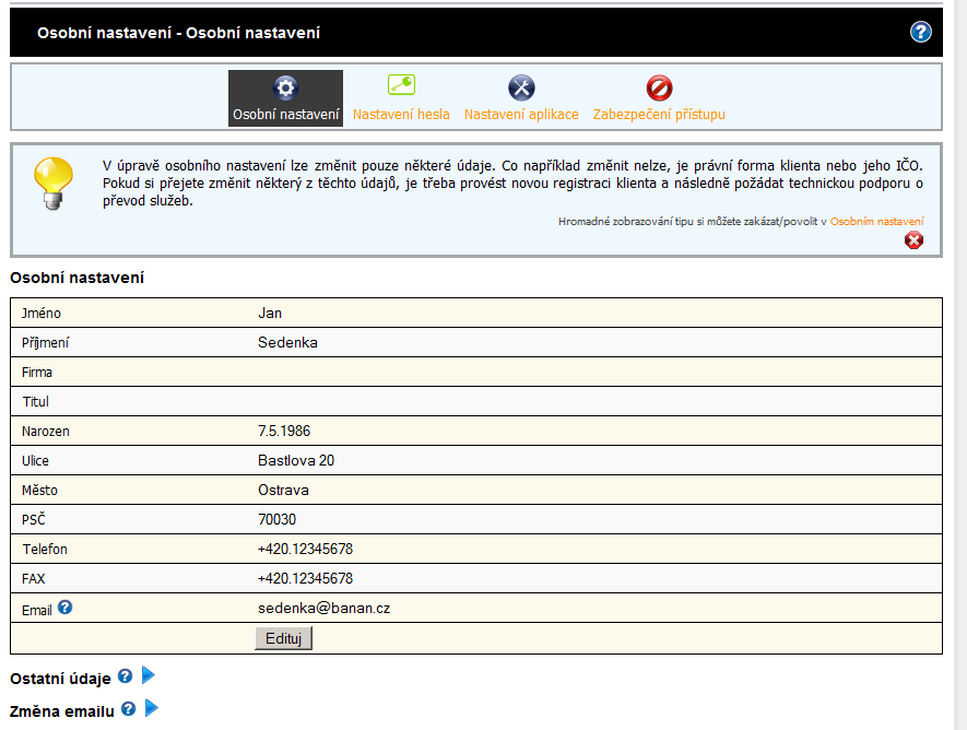 V úpravě osobního nastavení lze změnit pouze některé údaje. Co například změnit nelze, je právní forma klienta nebo jeho IČ. Pokud si přejete změnit některý z těchto údajů, je třeba provést novou registraci klienta na této stránce, sekce "Provizní systém" - registrace a poté požádejte technickou podporu o přesun služeb pod nové klientské ID.