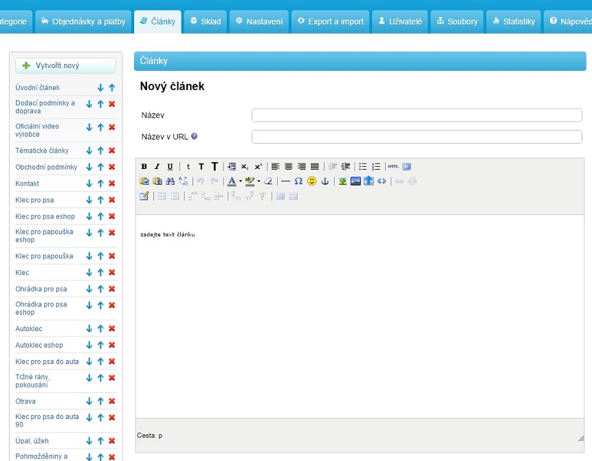 Na levé straně vidíte seznam všech článků a krom editace jednotlivých článků máte možnost i měnit jejich pořadí, či články mazat. Texty můžete přímo nahrát z MS Word a nebo je psát rovnou v administraci. Pomocí množství různých funkcí můžete vkládat do textů obrázky, tabulky, odkazy, HTML kódy, smajlíky a spoustu dalších věcí.
