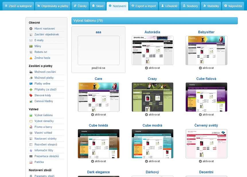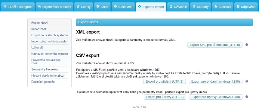 Tato sekce slouží k exportu a importu zboží. Jak pro zálohování zboží, tak pro nahrání nového zboží. Můžete si zde nechat exportovat faktury pro účetní systémy (např. Pohoda) nebo vyhledat duplicitní zboží ve Vašem e-shopu.