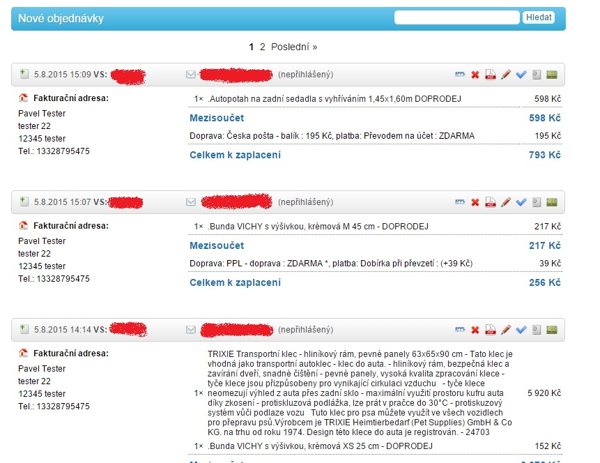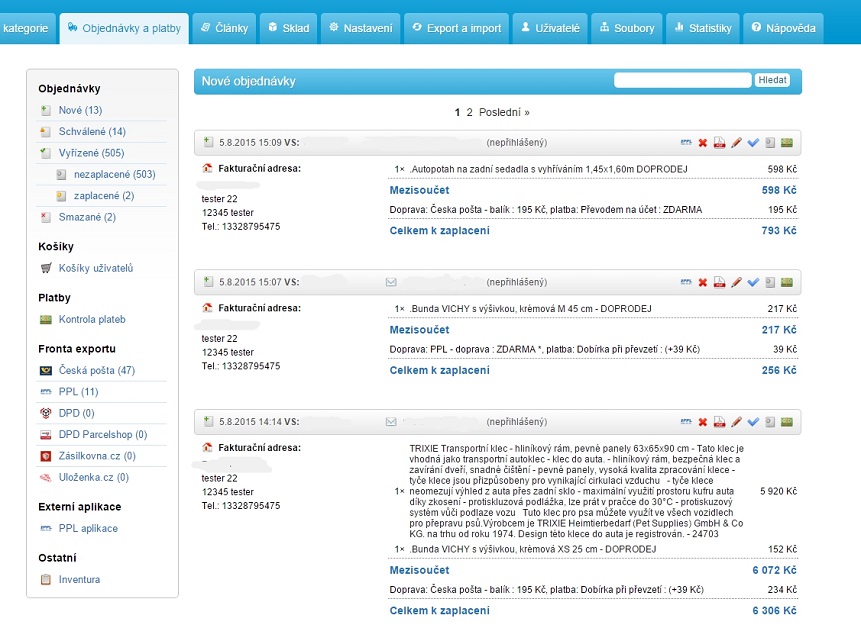 Po přihlášení do administrace e-shopu vás uvítá úvodní strana, na které se okamžitě zobrazí přehled nových objednávek.