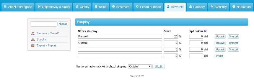 V záložce uživatelé můžete spravovat registrované uživatele e-shopu. Lze zde vytvářet slevové skupiny a poskytovat tak vybraným klientům slevy, editovat údaje jednotlivých uživatelů či vybraným uživatelům zasílat e-maily. Pro zálohu uživatelů můžete využít exportu dat, která můžete i naopak importovat.
