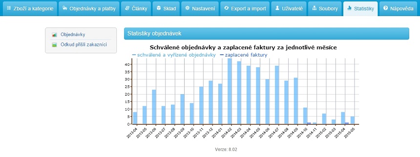 Ve statistikách máte přehledný graf schválených objednávek a zaplacených faktur. Také zde můžete zjistit odkud přišli zákazníci na Váš e-shop.