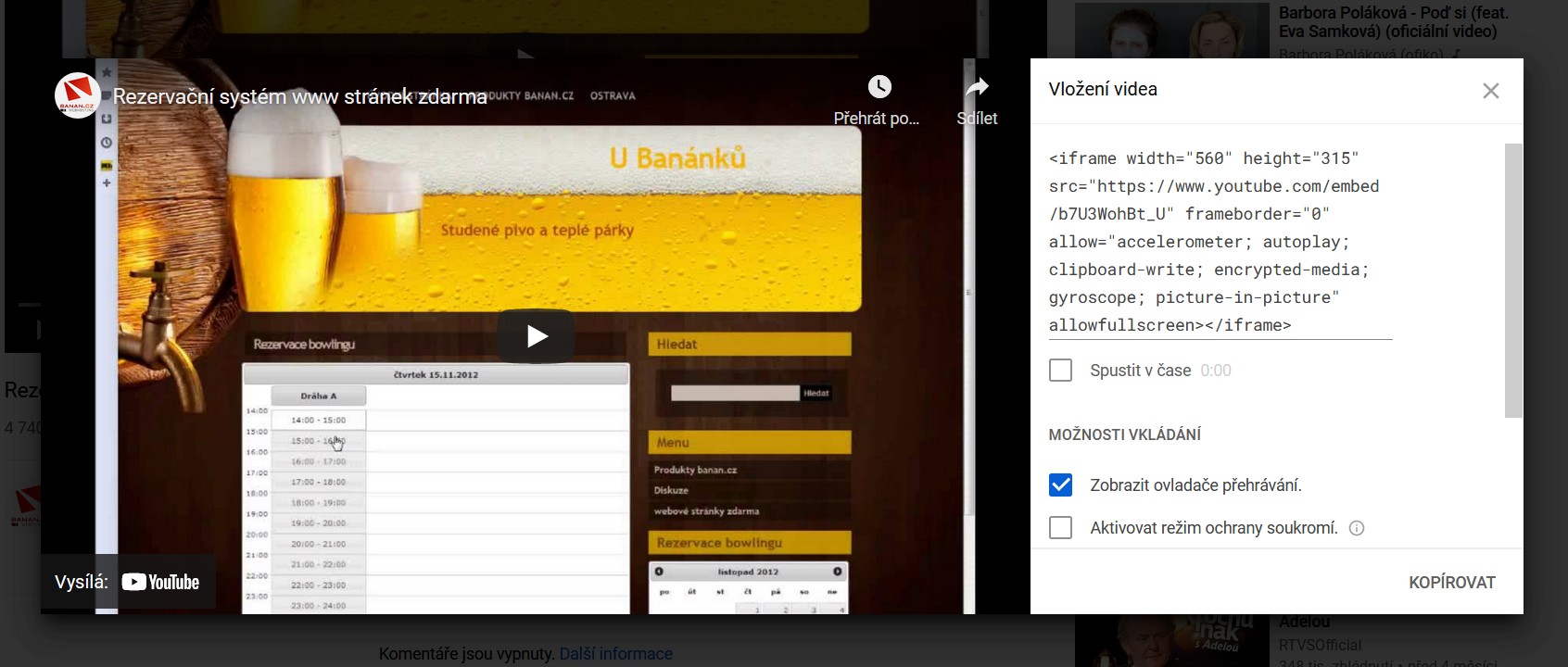 Zobrazí se kód vybraného videa, viz obrázek 14-3. Můžete nastavit spuštění v čase a aktivovat volby Zobrazit ovladače přehrávání a Aktivovat režim ochrany soukromí. Kliknutím na Kopírovat se kód označí a zároveň zkopíruje do schránky.