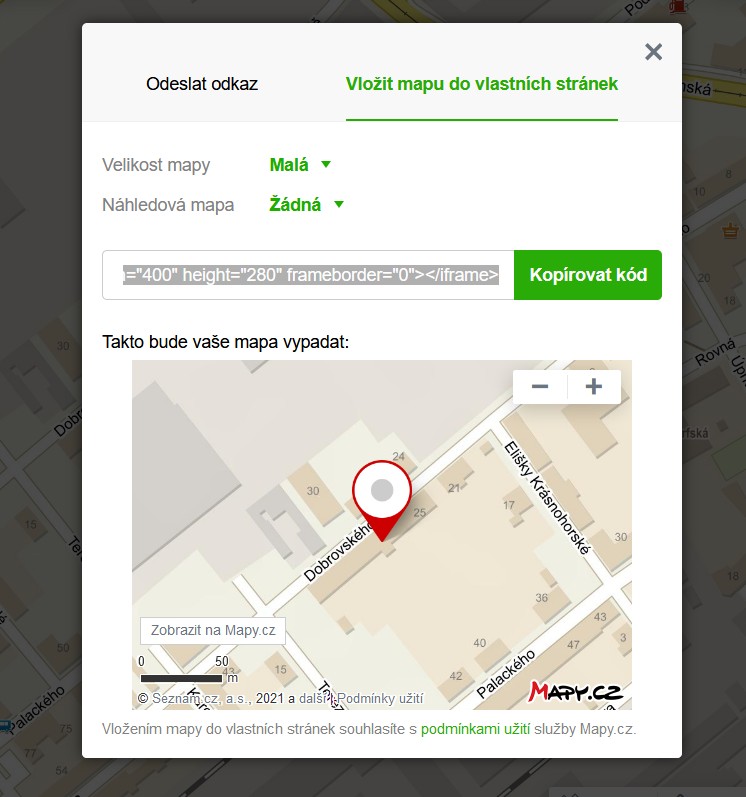 Zobrazí se dialogové okno pro sdílení, viz obrázek 14-5. Přejděte na záložku Vložit mapu do vlastních stránek. Zvolte si velikost mapy a popř. náhledovou mapu. Klikněte na Kopírovat kód.