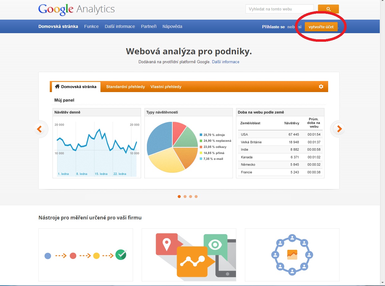 Pro vytvoření nového účtu je třeba na webové adrese http://www.google.cz/analytics kliknout na tlačítko vytvořte účet, které se nachází v pravém horním rohu, jak můžete vidět na obrázku níže.