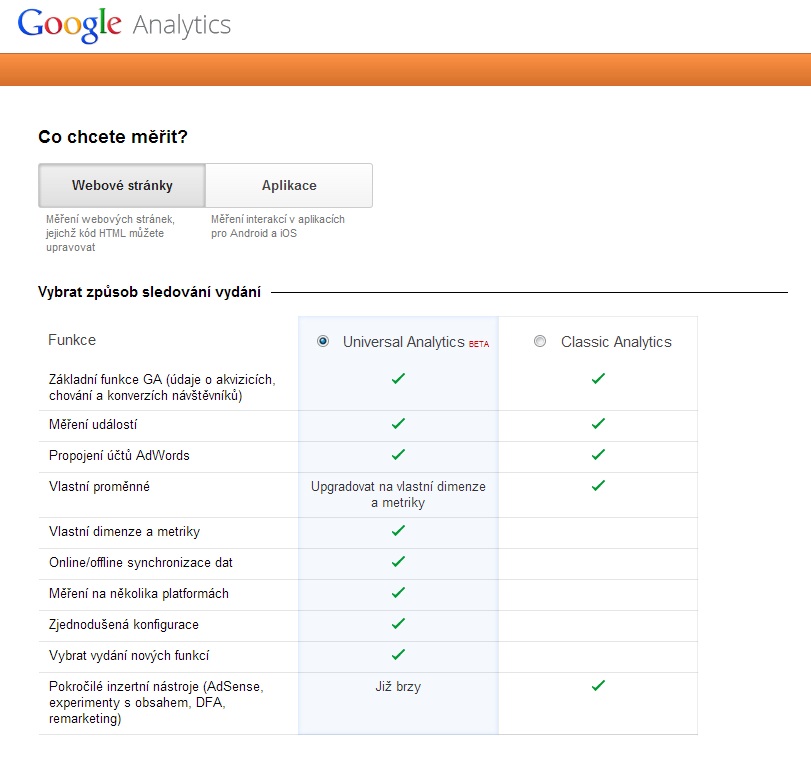 V první části vybíráte, zda chcete měřit webové stránky nebo aplikace. My se v této nápovědě omezíme na webové stránky. V rámci nich si můžete vybrat ze dvou sad funkcí, novější Universal Analytics, která je zatím ve fázi beta, a starší Classic Analytics. Verze Universal nabízí několik nových funkcí, které ve verzi Classic chyběly. Veškeré informace o této nové verzi naleznete zde.