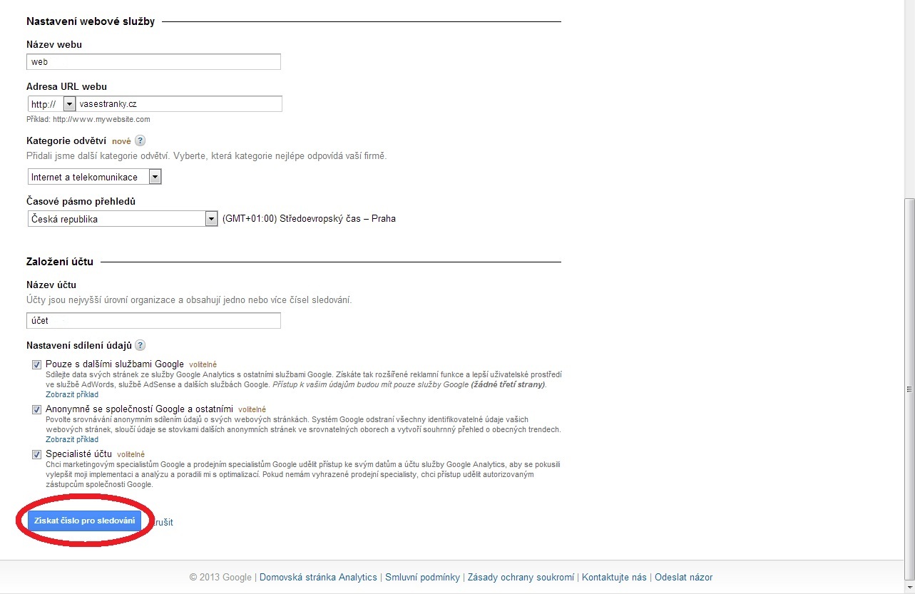 Ve druhé části pak vyplňujete URL adresu své domény a nastavujete další potřebné informace, viz obrázek níže. Úplně na konci se nachází Nastavení sdílení údajů, ve kterém máte tři možnosti, které jsou podrobně popsány a můžete je libovolně zaškrtnout.
