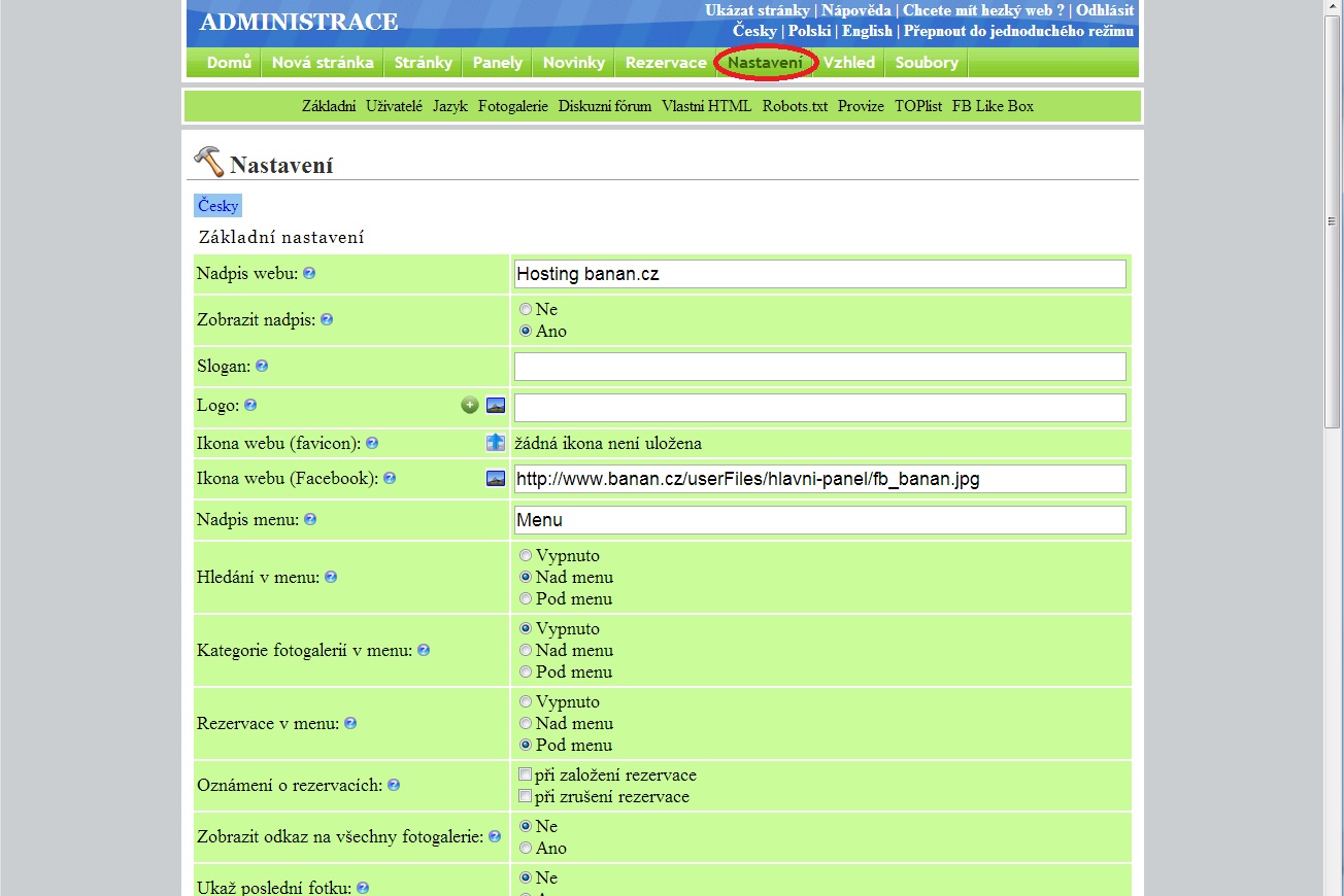 Posledním bodem, který je nutno udělat, aby došlo ke zprovoznení Google Analytics, je umístění tohoto měřícího kódu na stránky. My si ukážeme, kam tento kód vložit v našem redakčním systému. Po přihlášení do administrace stránek si vyberete možnost Nastavení.