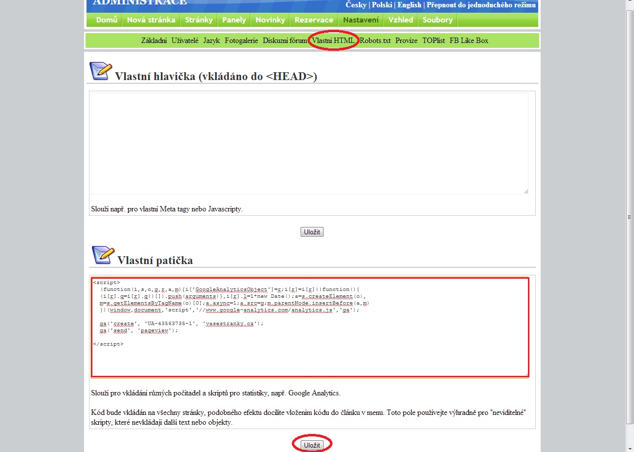 Poté klikněte na Vlastní HTML a zde do okna Vlastní patička vložte již zmíněný měřící kód. Změny je třeba ještě potvrdit kliknutním na tlačítko Uložit.