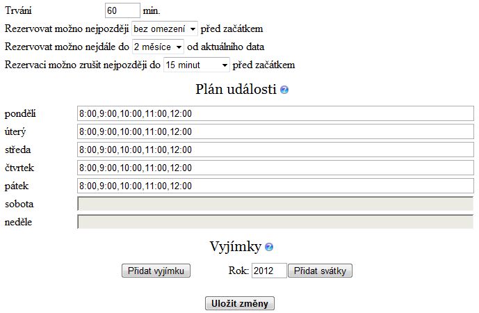 Jakmile máte tato kritéria zadána, tak můžete určit termíny pro rezervace. Ty zapisujete do jednotlivých dnů, pokud je více termínů v jeden den, tak je oddělujete čárkou. Čas se píše ve formátu HH:MM (hodina:minuta).