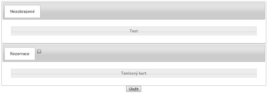 V této sekci jsou zobrazeny jednotlivé události rezervací. Pro aktivaci dané události je třeba tuto událost přesunout do panelu rezervace. Jednotlivé záložky budou po uložení tvořit samostatné kalendáře v menu a jejich názvy se stanou nadpisy. Přetažením více událostí do jednoho kalendáře docílíte spojení událostí - termíny se pak budou zobrazovat na stejné stránce.